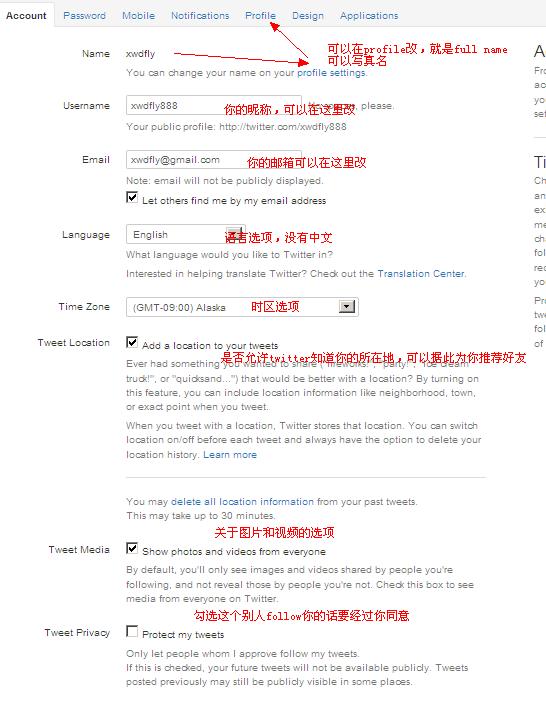 图一是Account的设置,最后一个选项图没截到,意思是你是否想设置为访问你的twiiter通过https安全方式 -